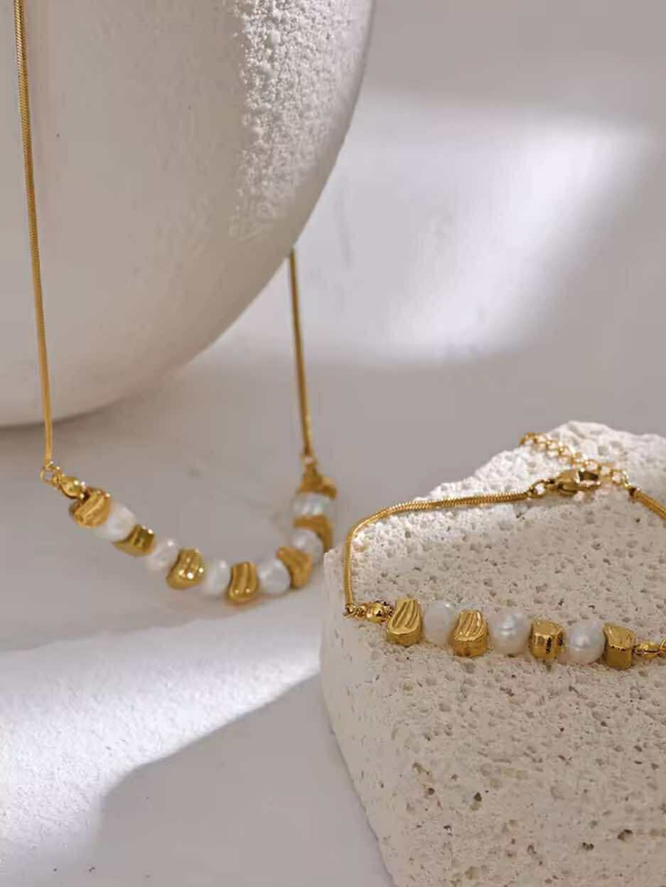The Golden Hour Bracelet captures the glow of late-afternoon sun in a wearable, everyday piece. With creamy freshwater pearls nestled between organically shaped, gold-plated stainless steel beads, it wraps your wrist in warmth and effortless charm. Think barefoot by the dam, a linen dress, and that soft stretch of time when everything slows down.