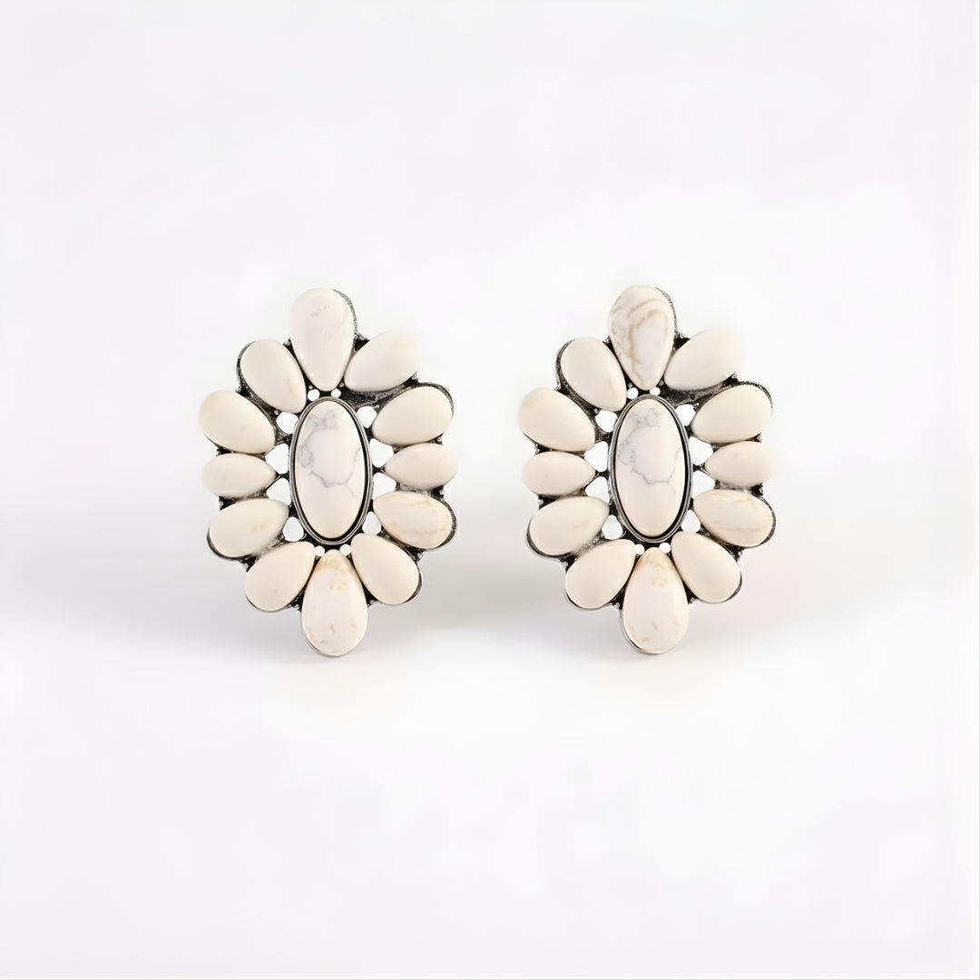 Bring refined Western beauty to your look with the Western Isla Pearl Bloom Earrings, featuring ivory-toned stone petals arranged in a radiant floral formation and finished with antique silver accents. With their gentle shimmer and artisan-inspired detailing, these earrings strike a balance between boho femininity and Western charm. Perfect for brunch dates, casual outings, or elegant evening events.
